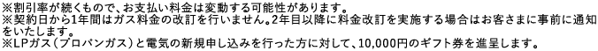 ※4:LPガスの割引料金は2年目以降も継続します。電気料金は供給開始後連続した10回分の月次検針による電気料金から基本料を50%割引致します。